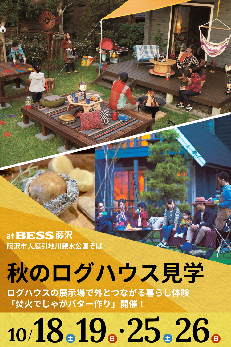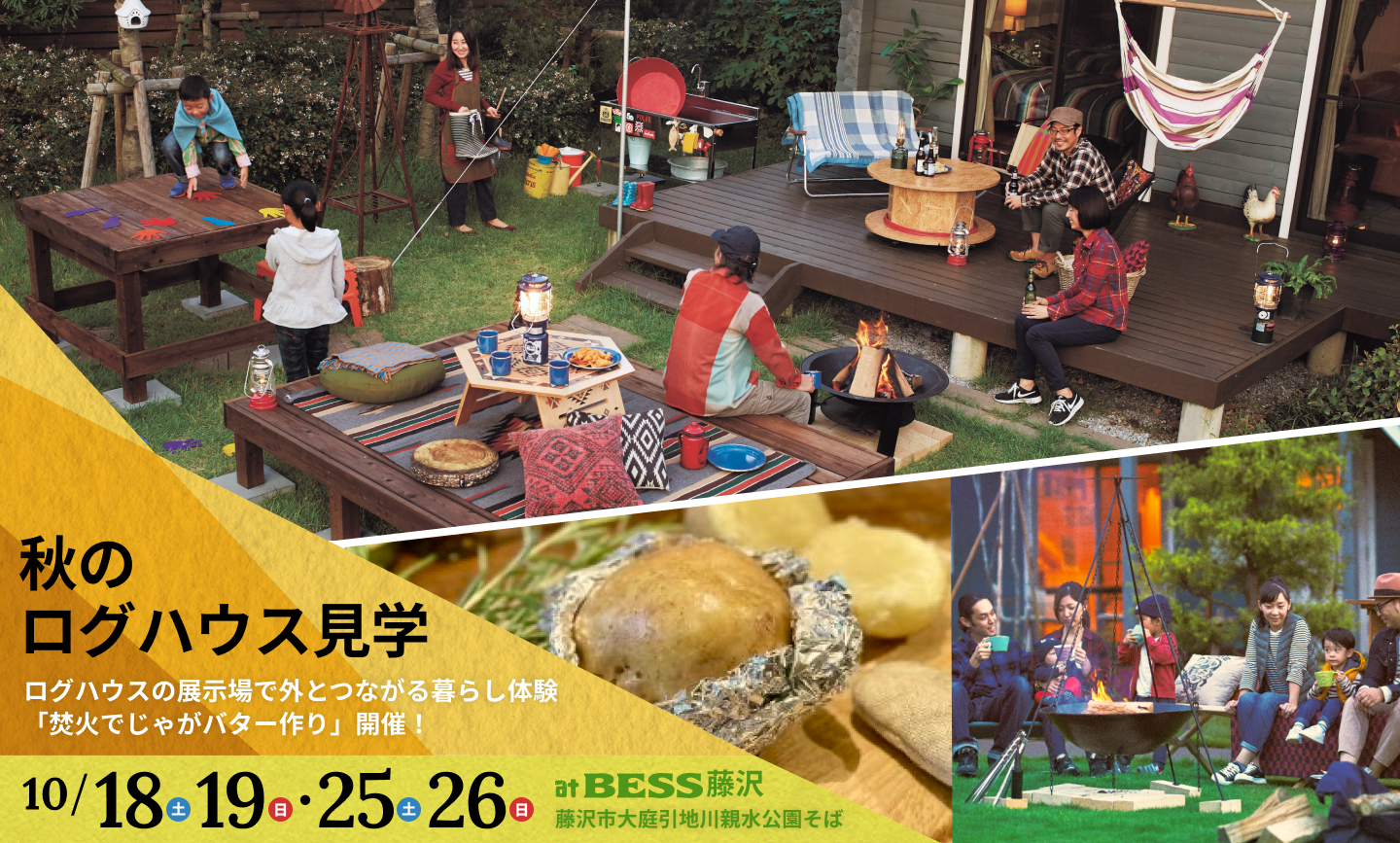 ログハウスや木の家が建ち並ぶBESSの展示場。自然の木をふんだんに使ったBESSのモデルハウスで、外とつながる暮らしを体感しよう!