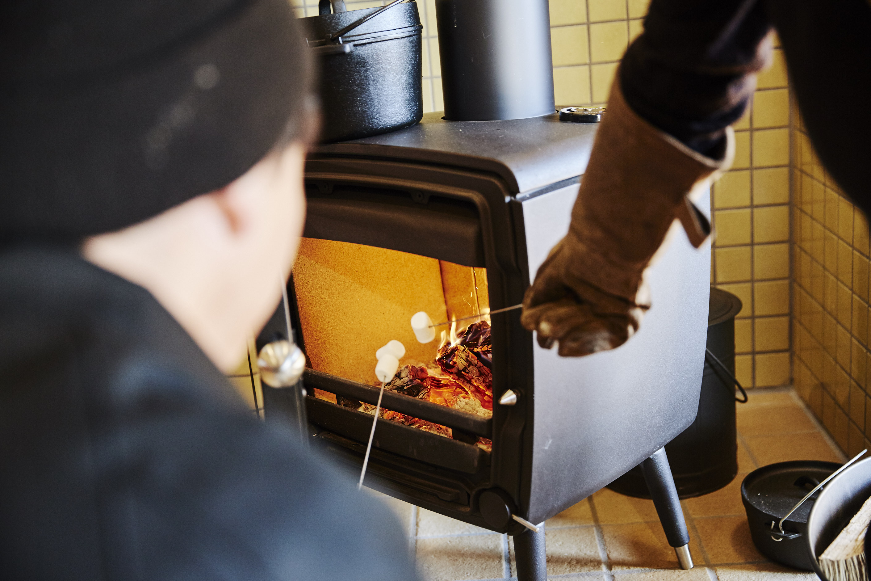 薪ストーブでとろ~り焼いたマシュマロにチョコソースをかけて、スモアをつくったり、
